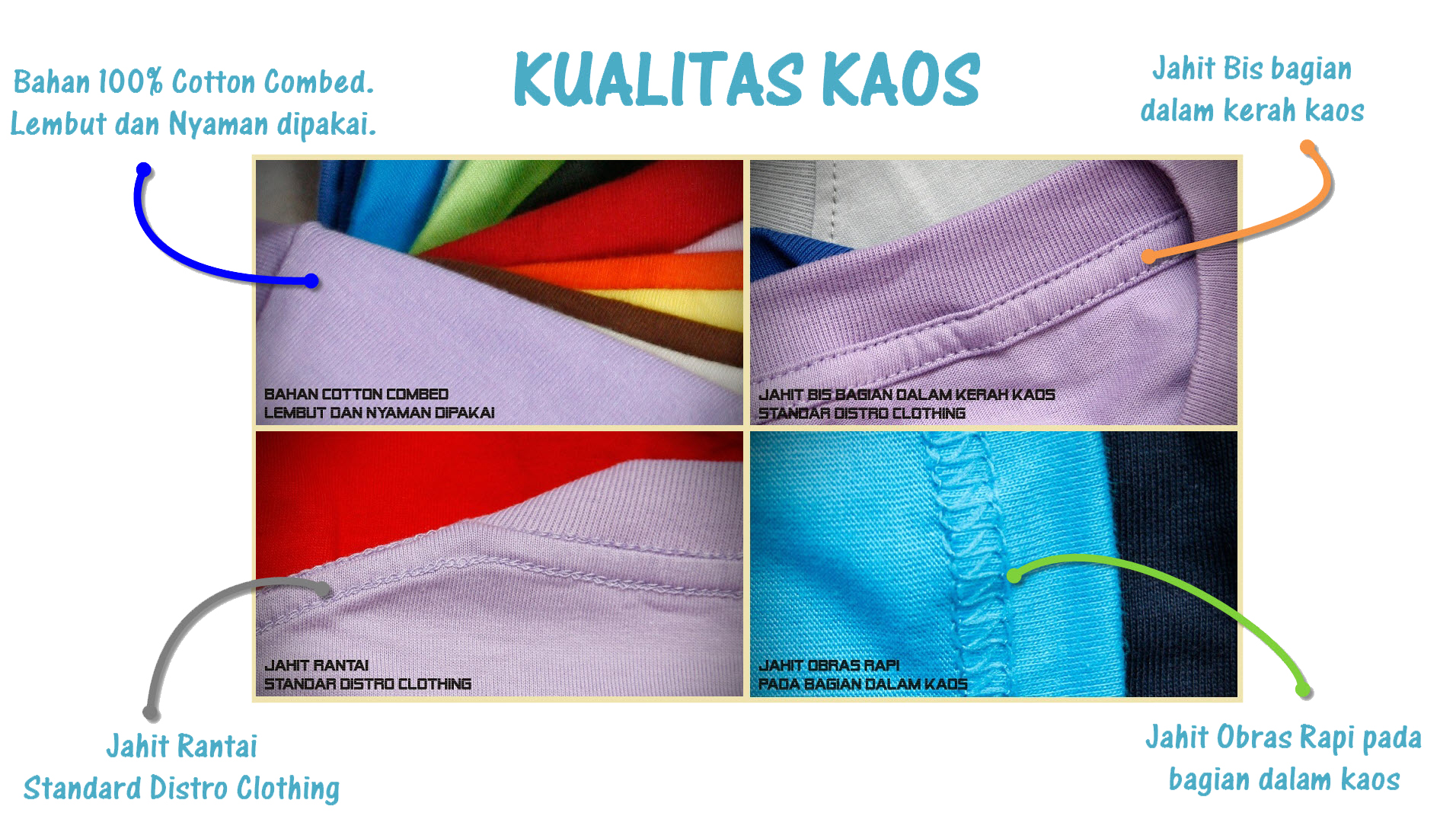- Jahitan rapi kualitas ekspor, model Jahit Rantai Standar DISTRO Clothing.